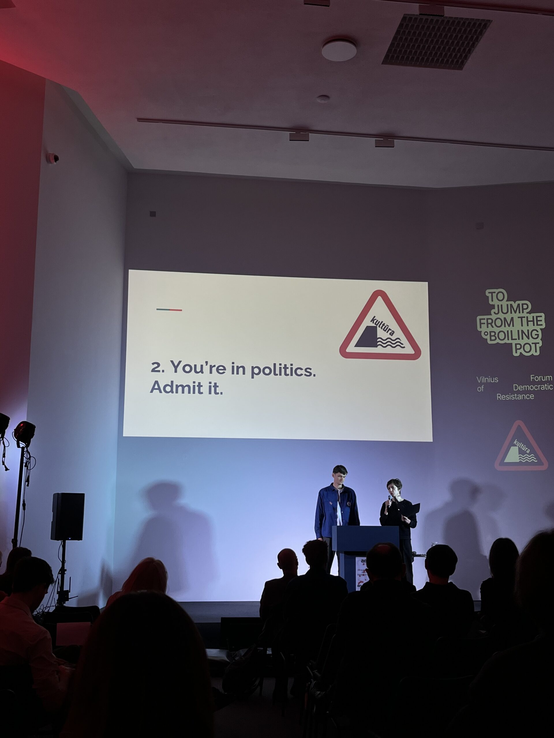 Grįžtant prie „How to Jump from the Boiling Pot?“ renginio, antrąją forumo dieną atidarė diskusija, kurioje dalyvavo Kultūros judėjimo pagrindinė komanda. Būtent čia aš pamačiau liberalios demokratijos politiką praktikoje. Kultūros profesionalė Dagnė (kino prodiuserė Dagnė Vildžiūnaitė – red. pastaba) prisipažino auditorijai, jog ji niekada pernelyg nesidomėjo politika, „tiesiog kūriau meną ir tiek“, tačiau vėliau ji pareiškė, jog „išmokta pamoka yra ta, kad reikia būti politiškai aktyviems, nes gali ateiti diena, kai liks tik piliečiai, kurie turės kovoti už mūsų nepriklausomybę, už laisvą šalį“.