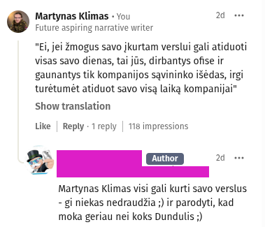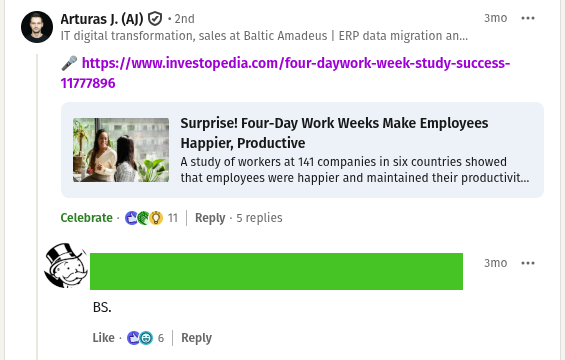 Bet grįžtam prie „LinkedIn“ ir keturių dienų darbo savaitės. Norisi paminėti ir mažytę diskusijos po šiuo postu dalį. Vienas žmogus kaip kontrargumentą pateikia mokslinį tyrimą: metaanalizė nustatė, kad iš maždaug 140 įmonių, pabandžiusių 4 dienų savaitės modelį, 90% prie jo ir liko. Darbuotojai teigė, kad jaučiasi geriau ir dirba produktyviau. Tačiau tai nėra taip svarbu (vadovams ir kitokiems LLRI mirtininkams) kaip mintis, kurią perša faktas, kad 9/10 kompanijų liko prie 4 dienų modelio. Produktyvumas ir pelningumas nekrito. Aiman, gal net ir augimo buvo.